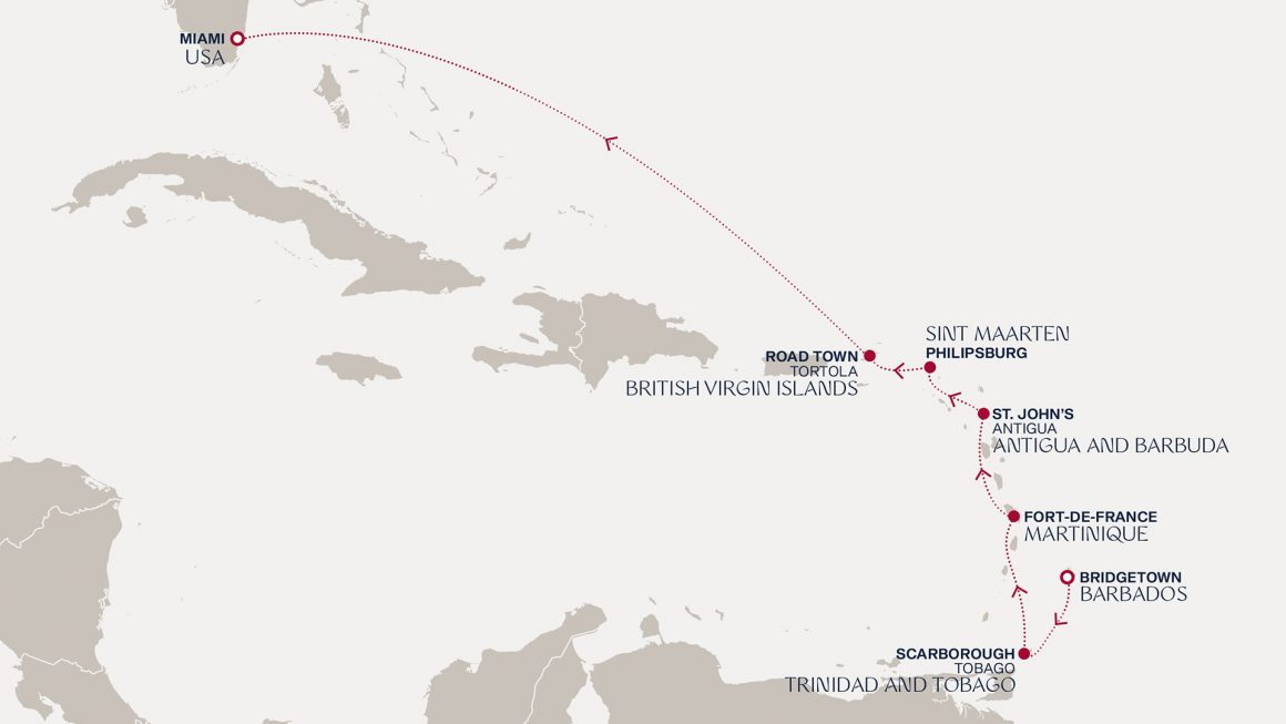De Bridgetown (Barbados) a Miami, passando por Scarborough (Tobago, Trinidad e Tobago), Fort-de-France (Martinica), St. John’s (Antígua e Barbuda), Philipsburg (Sint Maarten) e Road Town (Tortola, Ilhas Virgens Britânicas).