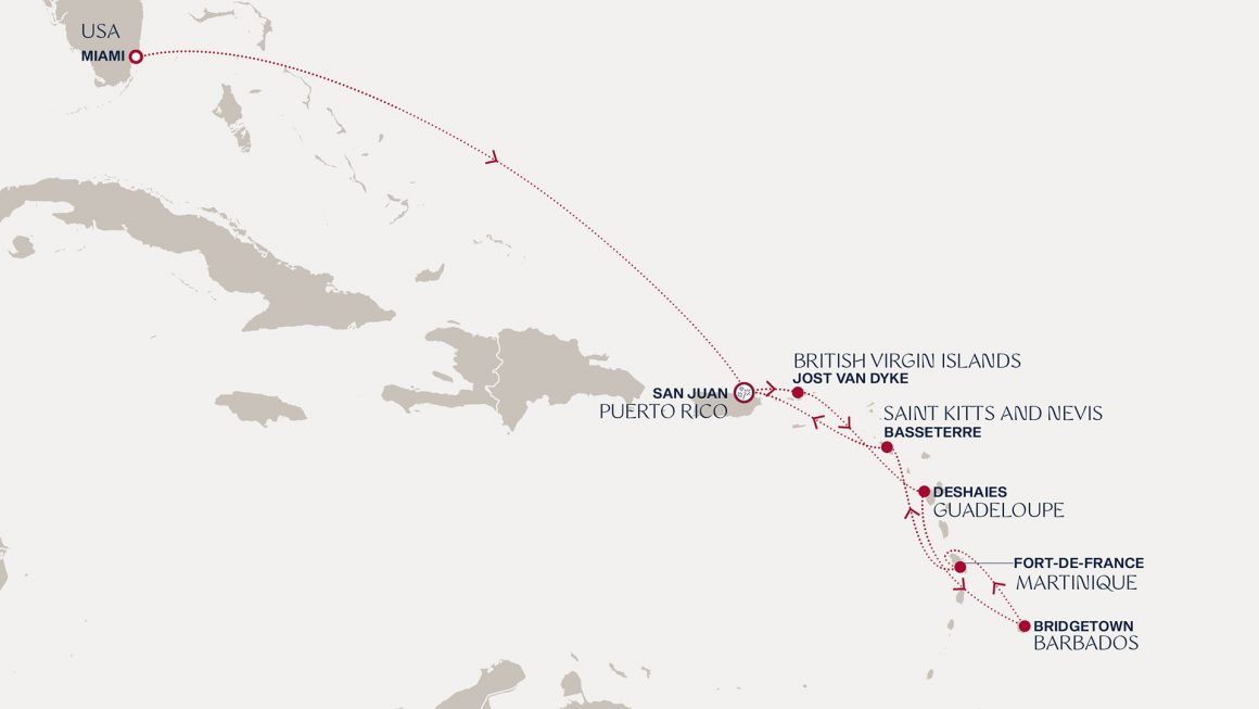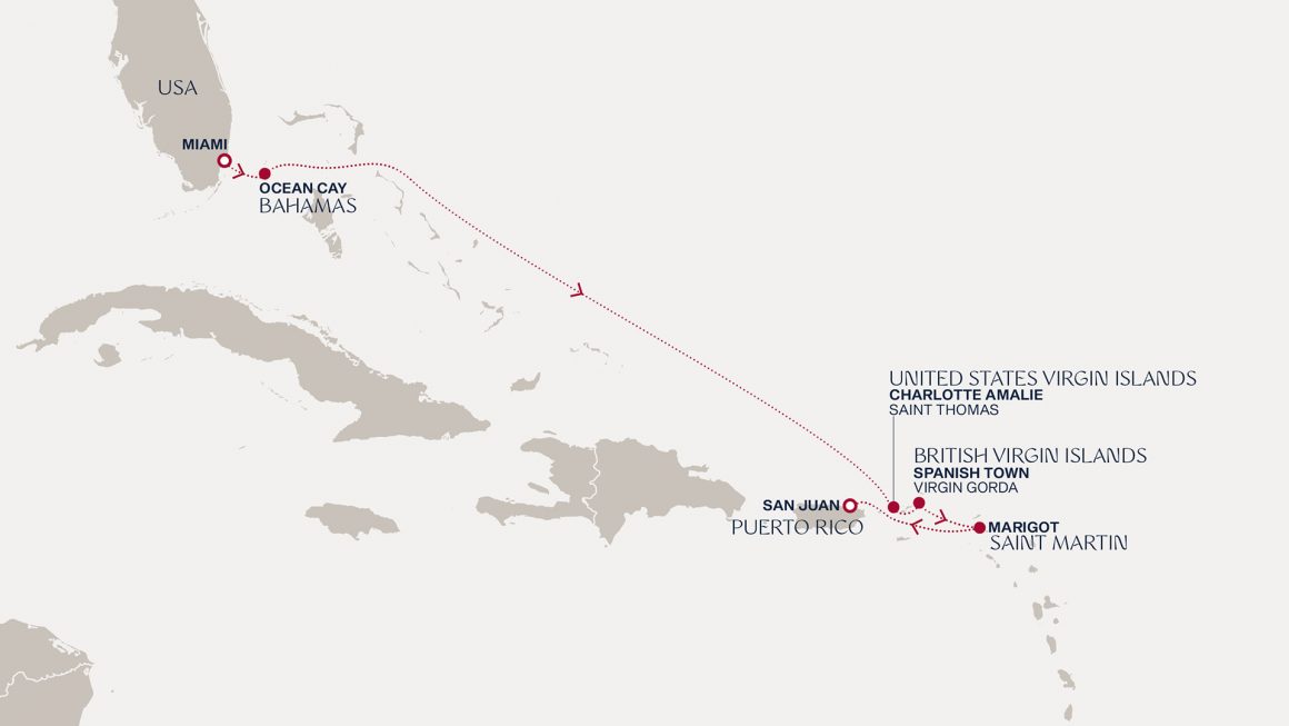 De Miami a San Juan, passando por Ocean Cay (Bahamas), Charlotte Amalie (St. Thomas, Ilhas Virgens Americanas), Spanish Town (Virgin Gorda, Ilhas Virgens Britânicas) e Marigot (Saint Martin, Índias Ocidentais Francesas).