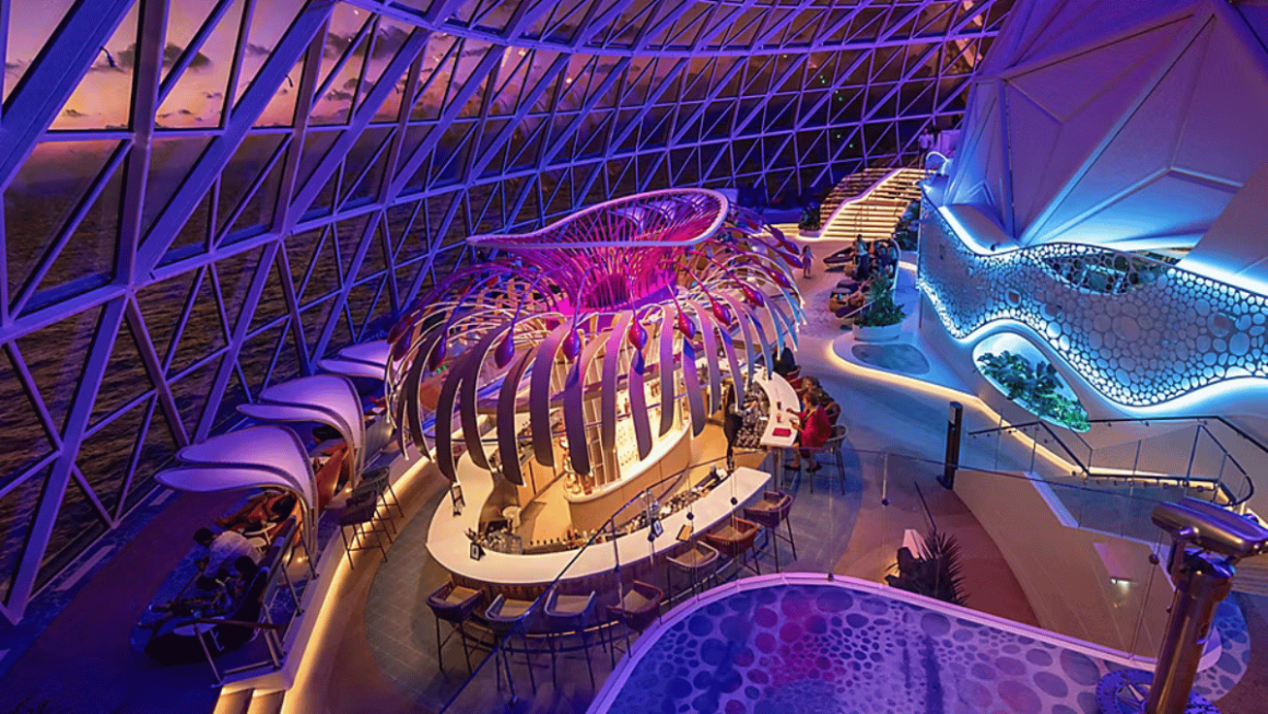 No The Overlook, a noite ganha novas perspectivas em um lounge localizado dentro do AquaDome. O espaço conta com dois níveis de janelas do piso ao teto, oferecendo amplas vistas do oceano. Nos elegantes Overlook Pods, é possível encontrar um ponto tranquilo para encontros, relaxar ao som de música ao vivo ou aproveitar um coquetel antes de assistir a um espetáculo no AquaTheater. Posicionados para garantir panoramas privilegiados do mar, esses espaços foram projetados para momentos de descanso e contemplação em alto-mar.