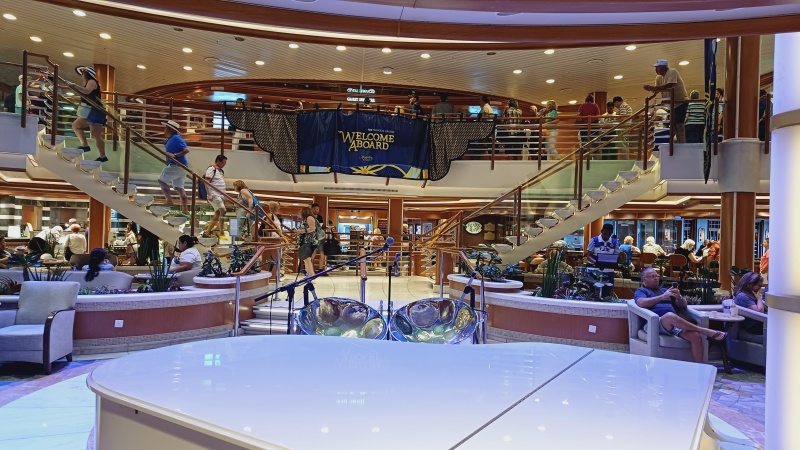 A The Piazza, ou atrium principal, é o coração do navio, localizada no deck 5. Entre os elevadores panorâmicos está uma área onde se apresentam diariamente artistas com piano, violino, cantores e até banda. Vários lounges ao redor, com sofás e poltronas, reúnem os hóspedes que desejam assistir ao show, ou apenas degustar um drink preparado pelos atenciosos bartenders do Good Spirits Bar.