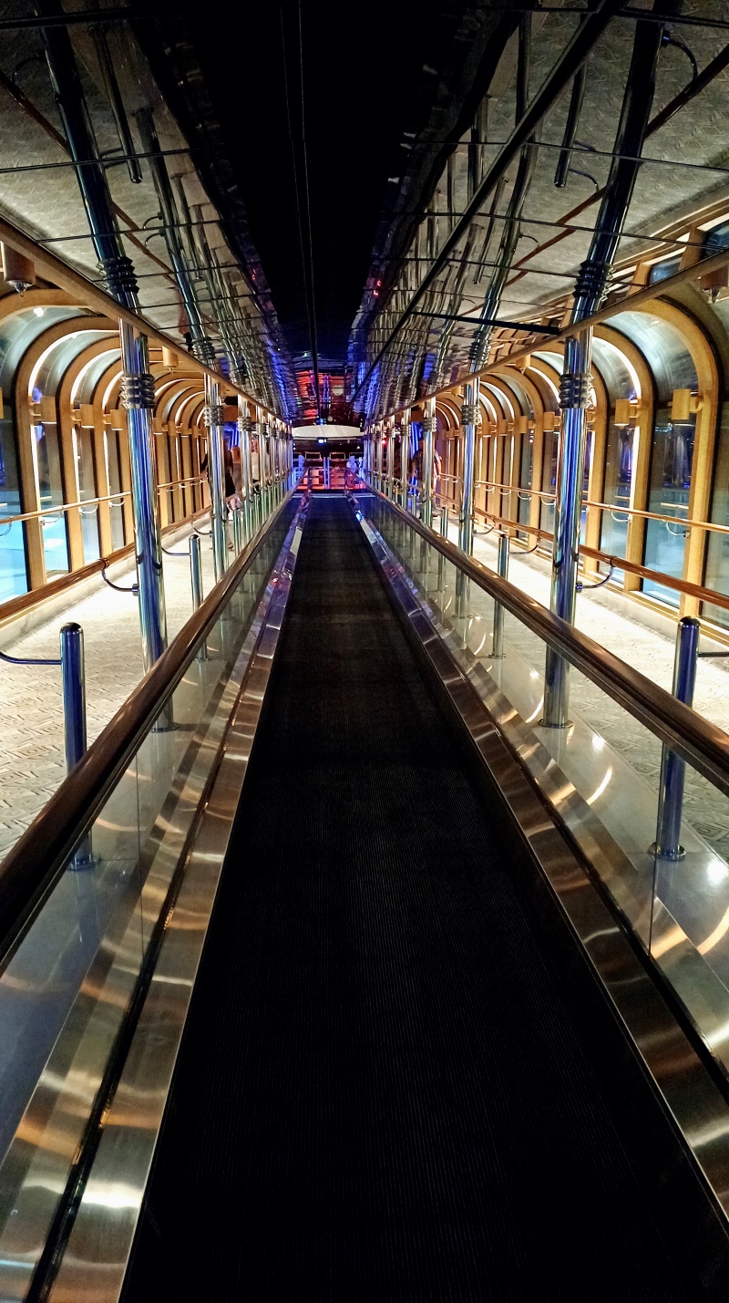 Todos momentos entremeados com drinks refrescantes e comidinhas apetitosas, das quais já vamos falar mais. Para fechar a noite, o Skywalkers Nightclub é o ponto alto. Localizado no deck 19, acima da popa do navio, uma pista de dança com trilha caribenha e hits de vários gêneros musicais embala os convidados. A chegada ao local é pomposa e impactante, onde uma esteira rolante com cerca de 20 metros nos conduz por um amplo túnel de vidro até a pista.