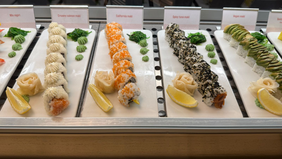 O cardápio do Sushino reúne diferentes categorias de sushi, permitindo montar a refeição de acordo com a preferência do viajante. Entre as opções estão sashimis, servidos em porções com oito fatias de peixe cru, como salmão, atum (Sako Tuna), polvo e vieira. Já os nigiris trazem combinações clássicas como salmon nigiri, tuna nigiri, shrimp nigiri e o tamago nigiri, preparado com omelete japonesa.