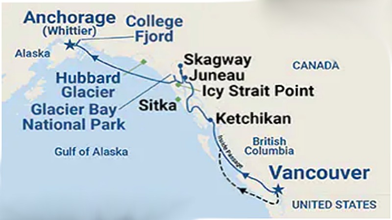 A maioria dos cruzeiros partem do Canadá e também da costa oeste dos Estados Unidos e visitam os portos mais turísticos do Alasca. Entre eles, Ketchikan, conhecida como a capital do salmão; Sitka; Juneau, a capital do Alasca; Skagway e Anchorage (Whittier). Alguns roteiros inclusive priorizam permanências mais estendidas para o hóspede poder aproveitar tudo que os destinos oferecem, de culinária até atrações locais.