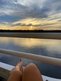 Contato com animais selvagens | Foto: Arquivo pessoal Comodidades a bordo encantam cruzeiristas | Foto: Arquivo pessoal Por do sol no a beira do Grand Amazon | Foto: Arquivo pessoal Nicole Werneck Ferreira navegou pelo Grand Amazon | Foto: Arquivo pessoal
