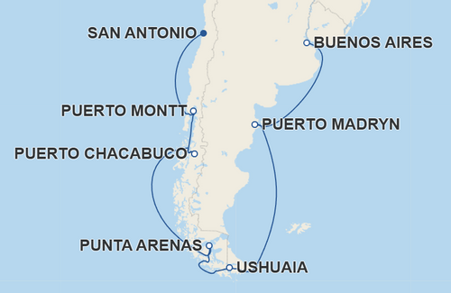 Roteiro: Puerto Montt, Puerto Chacabuco, Punta Arenas, Ushuaia, Puerto Madryn