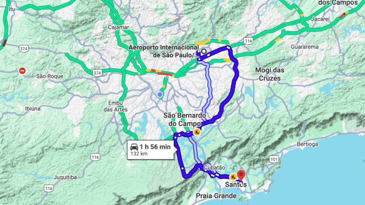 O Aeroporto Internacional de Guarulhos (GRU) é o principal ponto de chegada de voos nacionais e internacionais, mas também o mais distante do litoral. Ainda assim, o trajeto até Santos é bem estruturado e conta com alternativas eficientes.