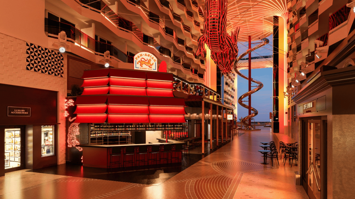 4) NOVO! Pan-Asian Street Food: este animado espaço gastronômico oferecerá uma experiência de jantar com bar dedicado e convidativa área externa, com opções para comer no local ou “on the go”. Com foco na culinária do Sudeste Asiático — incluindo sabores de Singapura, Tailândia, Laos, Hong Kong, Vietnã e Indonésia — este restaurante especializado transportará os hóspedes para um mundo de sabores, texturas e histórias da região, de uma forma inédita no mar.