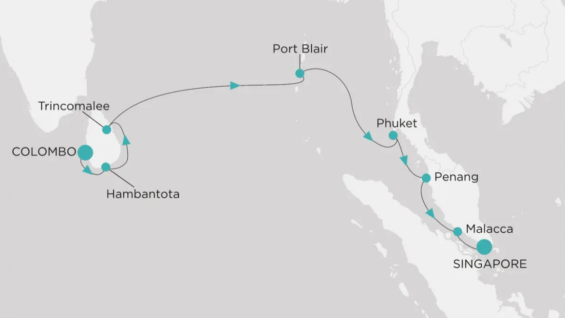 Partindo de Colombo, no Sri Lanka a bordo do Crystal Symponhy, em 21 de fevereiro de 2026, este itinerário explora regiões do Oceano Índico e do Sudeste Asiático. As paradas incluem Port Blair, nas Ilhas Andamão (Índia), Phuket, Penang e Malaca, oferecendo praias tropicais, culturas locais únicas e natureza exuberante ao longo do caminho.