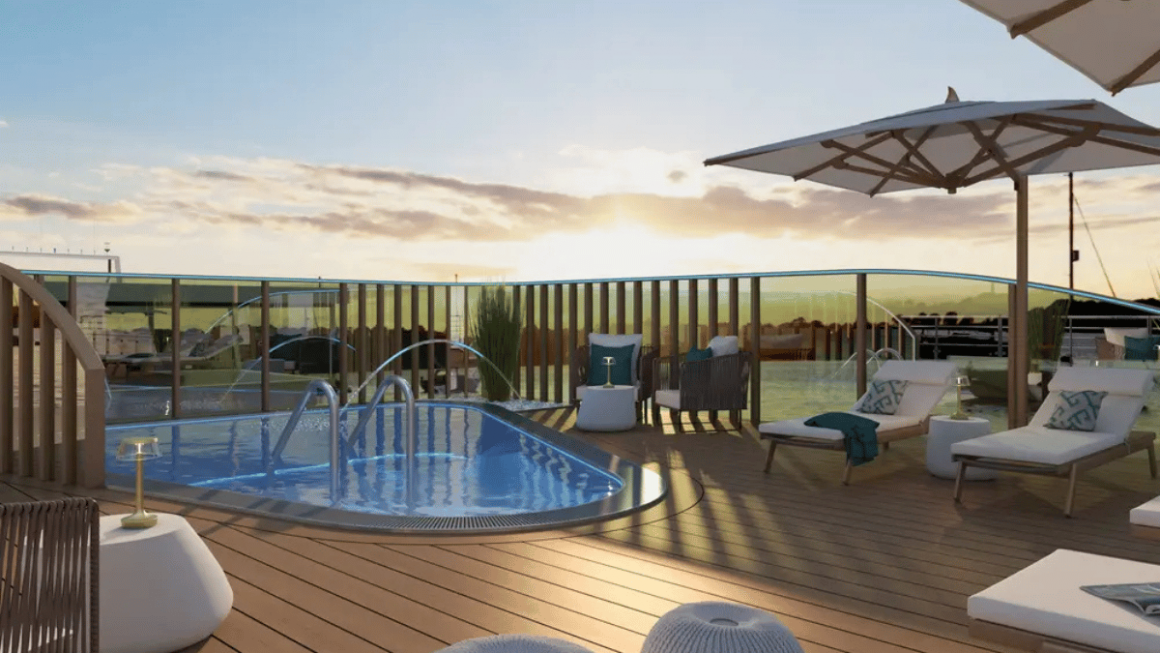 Entre as áreas comuns estão restaurante panorâmico, terraço com piscina ao ar livre e bar, academia e um deck com vista privilegiada para o rio — espaços pensados para proporcionar uma navegação confortável e intimista ao longo do Reno.