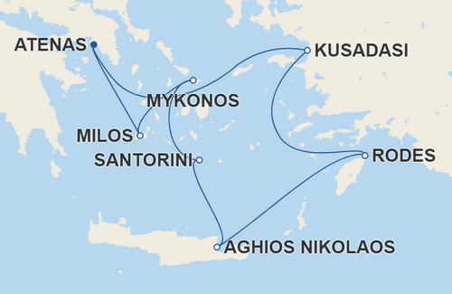 Atenas · Kusadasi · Rodas · Creta · Santorini · Mykonos · Milos · Atenas