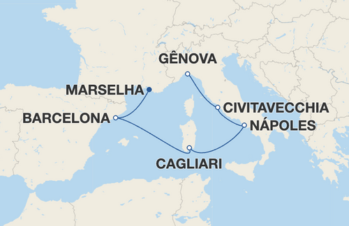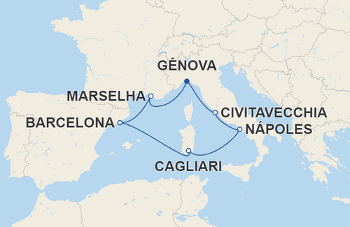 A partir de sexta-feira, dia 11 de abril, e semanalmente todas às sextas-feiras até o dia 21 de novembro de 2025, o Costa Smeralda parte de Gênova para um itinerário de oito dias pelo Mediterrâneo Ocidental, para descobrir a Itália, a França e a Espanha, entre atmosferas atemporais, cidades de arte, praias e paisagens esplêndidas, com paradas em Marselha, Barcelona, Cagliari, Nápoles e Civitavecchia/Roma, retornando então a Gênova.
