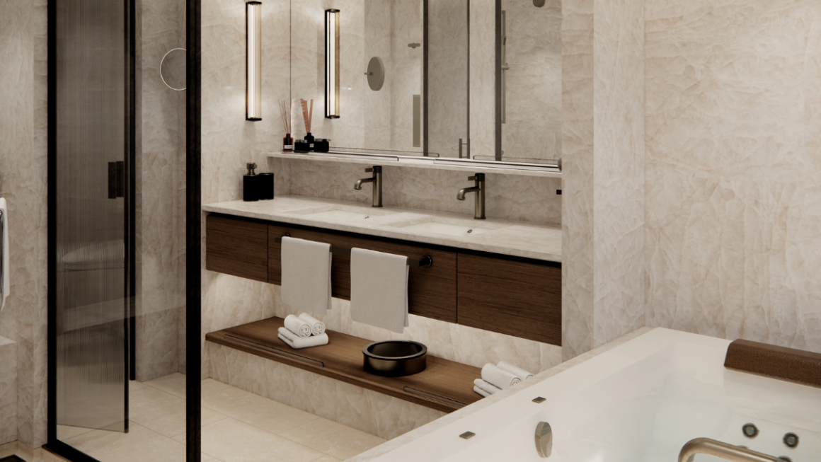Algumas suítes selecionadas possuem chuveiro e banheira separados, enquanto outras oferecem um chuveiro espaçoso e closet.
