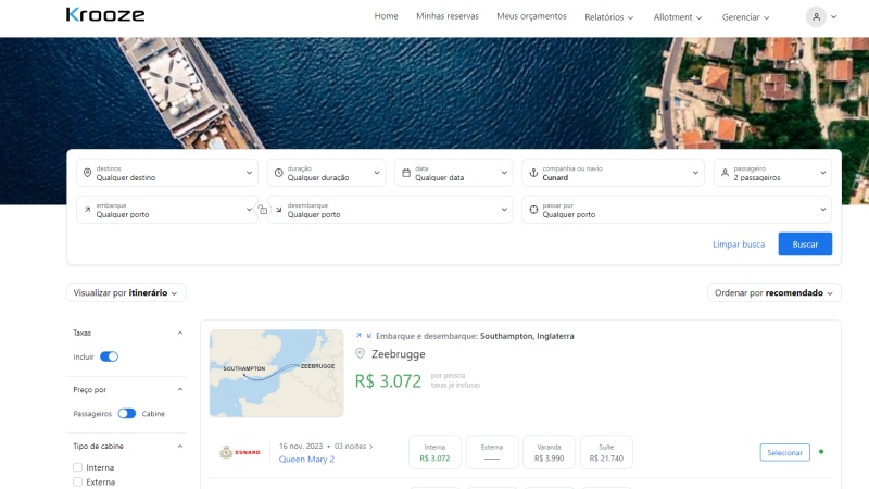 A Cunard, companhia britânica com 183 anos de operação, representada com exclusividade pela Discover Cruises no Brasil, estreia no sistema de reservas da Krooze, disponível para operadoras e agências de viagem. O que isso quer dizer? Os agentes que utilizam este software poderão acessar tudo sobre os cruzeiros da empresa. Dessa forma, informações atualizadas sobre os navios da frota, datas de saída, portos de embarque e desembarque, destinos e roteiros são acessíveis por meio de campos de busca intuitivos. Os resultados aparecem de forma rápida, ilustrados por fotos e mapas. Além disso, permite escolha de cabines, visualização das tarifas, geração de orçamentos e realização de reservas, facilitando, assim, todo o atendimento aos clientes.