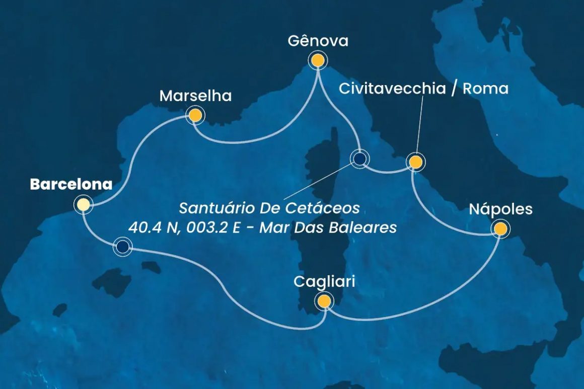 No Costa Pacifica, o viajante tem a oportunidade de aproveitar o desconto em roteiros de 7 noites embarcando em Barcelona e Civitavecchia (Roma) que passará por Marselha, Savona, Palermo e La Goulette, na Tunísia. Ao optar por embarcar em Civitavecchia, o hóspede pode realizar cruzeiros que visitam Palermo ou Olbia, Valência, Palma de Maiorca, Toulon La Seyne Sur Mer e Savona.