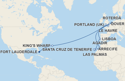 Roteiro: King’s Wharf, Portland (UK), Le Havre, Dover, Agadir, Arrecife, Las Palmas de Gran Canaria, Santa Cruz de Tenerife, Lisboa