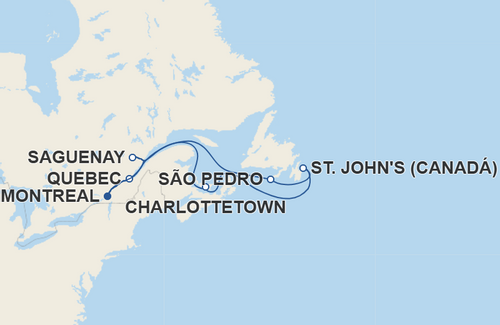 Roteiro: Montreal, Cidade de Quebec, Saguenay, Cruising Gulf of St. Lawrence, Charlottetown, Sydney, Halifax, Portland.