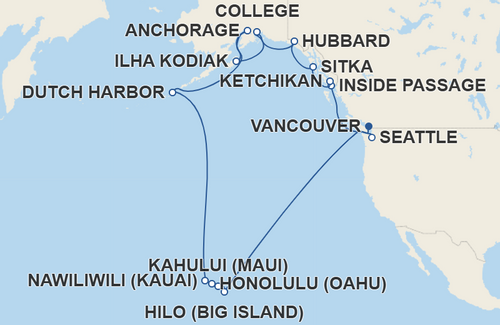 Roteiro: Inside Passage, Ketchikan, Sitka, Hubbard, College, Ilha Kodiak, Anchorage, Dutch Harbor, Nawiliwili (Kauai), Honolulu (Oahu), Kahului (Maui), Hilo (Big Island)