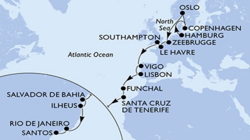 - Roteiro inclui paradas em portos no norte europeu como Copenhague (Dinamarca), Oslo (Noruega), Bruges (Bélgica), e o porto de Le Havre, próximo a Paris (França). Em seguida, o navio visita Southampton (Inglaterra) e Vigo (Espanha), de onde é possível visitar Santiago de Compostela. Sua última parada em continente é a cidade de Lisboa (Portugal). Navega então para a Ilha da Madeira e Tenerife, nas Ilhas Canárias (Espanha), cruzando o Oceano Atlântico até Salvador (Bahia). Na etapa final da viagem faz escalas em Ilhéus e Rio de Janeiro, antes do desembarque em Santos.