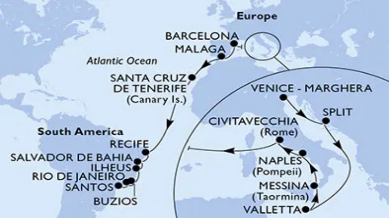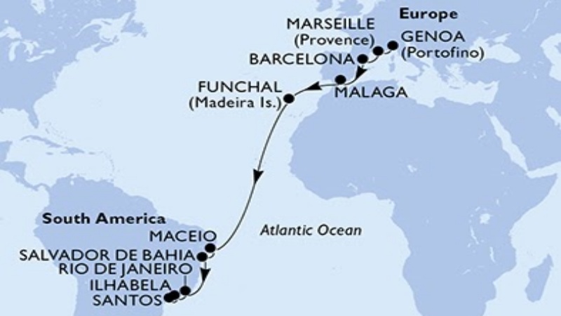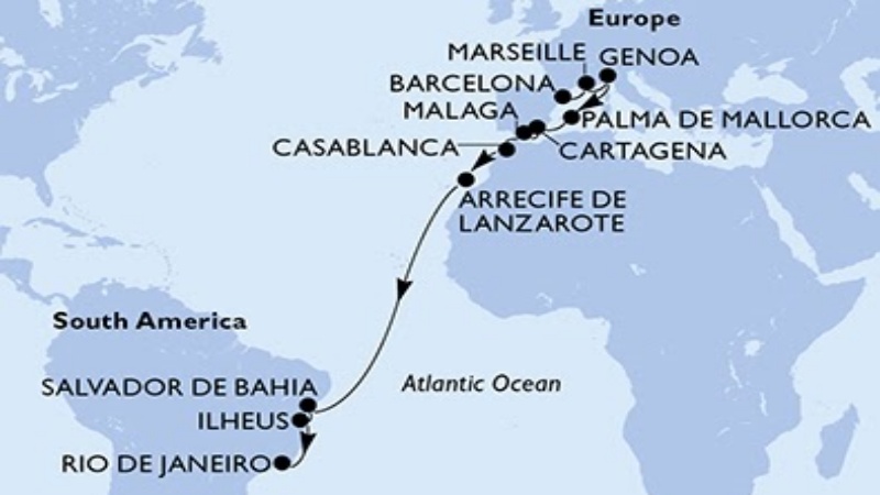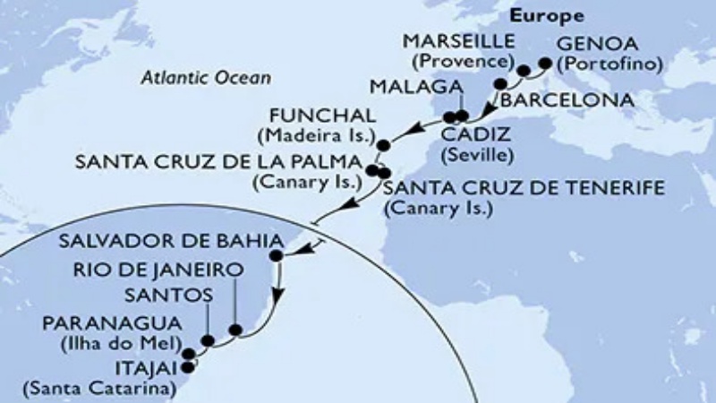 - Roteiro inclui paradas em Marselha (França); Barcelona, Málaga e Cádiz, na Espanha; Funchal (Ilha da Madeira); Santa Cruz De La Palma, na Espanha; e Santa Cruz de Tenerife, nas Ilhas Canárias. A primeira cidade brasileira visitada será Salvador, seguida de Rio de Janeiro, Santos e Paranaguá, com desembarque final em Itajaí.
