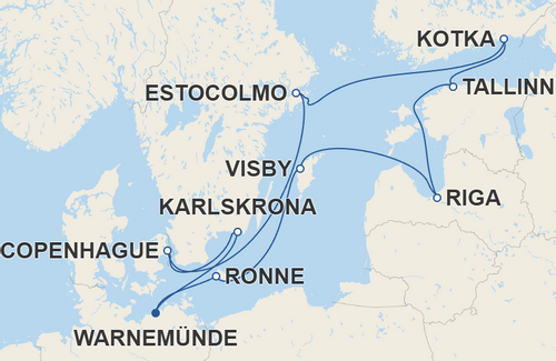 Roteiro: Ronne, Visby, Riga, Tallinn, Kotka, Estocolmo, Copenhague, Karlskrona