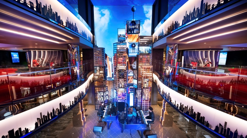 Os restaurantes principais, incluídos na tarifa do cruzeiro, levam nome de importantes referências da cidade – 5th Avenue, Central Park e Tribeca. Ainda na decoração do cassino, encontra-se uma grande réplica da Estátua da Liberdade, bem como uma cenografia pulsante, com neons e telões, que emoldura shows de música ao piano, numa referência à Broadway e ao skyline da cidade. Mesmo o espetáculo teatral é uma referência a criações contemporâneas encenadas em teatros nova-iorquinos, combinando performances de malabarismo e equilíbrio, com música e luzes.