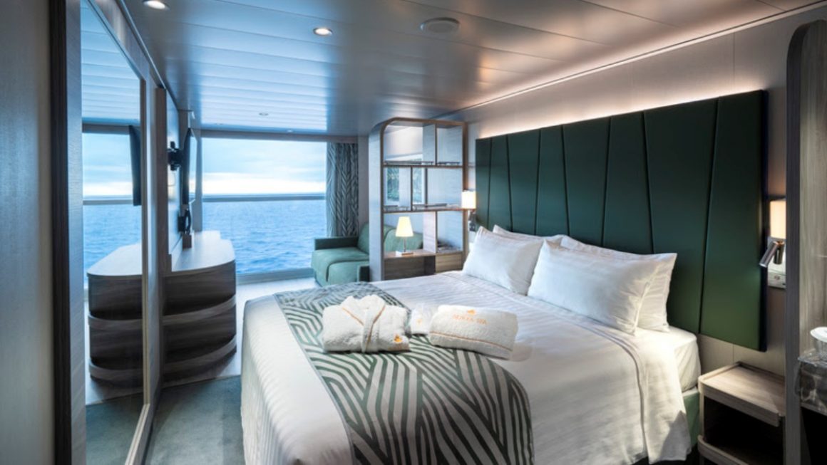 CABINES INFINITE OCEAN VIEW: outra exclusividade dos navios da classe World, essas elegantes cabines possuem uma janela panorâmica deslizante, que se transforma em uma balaustrada de vidro ao ser aberta, conectando os hóspedes ao mar e oferecendo vistas ininterruptas do horizonte.