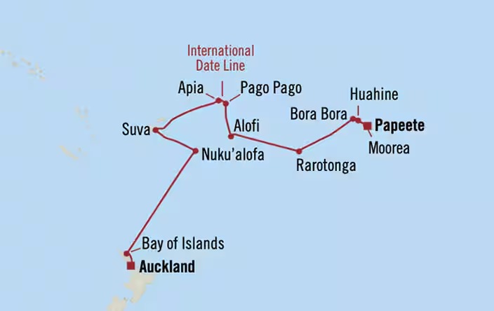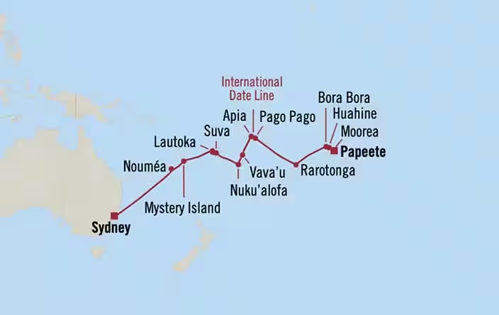 Roteiro: Noumea, Mystery Island, Lautoka, Suva, Nuku’alofa, Vava’u, Apia, Pago Pago, Rarotonga, Bora Bora, Huahine e Moorea