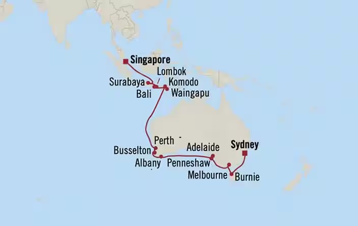 Roteiro: Surabaya, Bali, Lombok, Komodo, Waingapu Sumba, Perth, Busselton, Albany, Kangaroo Island, Adelaide, Melbourne e Burnie