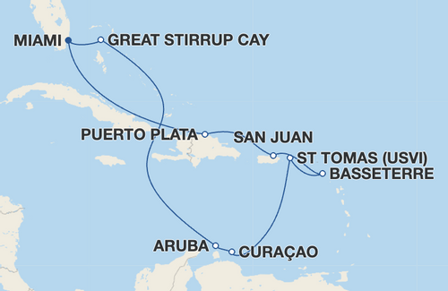 Roteiro: Great Stirrup Cay, Oranjestade, Willemstad, St Tomas, Basseterre, San Juan, Puerto Plata