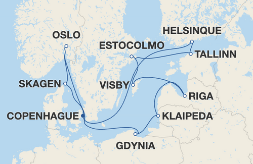 Roteiro: Visby, Estocolmo, Helsinque, Tallinn, Riga, Klaipeda, Gdynia, Oslo, Skagen