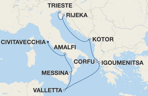 Ao longo do Mediterrâneo, a Costa Amalfitana encanta com suas paisagens de tirar o fôlego, seguida pela cidade histórica de Messina, na Sicília. Valeta, a capital de Malta e Patrimônio da UNESCO, proporciona uma verdadeira imersão na cultura mediterrânea, enquanto os portos gregos de Igoumenitsa e Corfu combinam história, paisagens exuberantes e um charme singular. Até 59 passeios em terra estão incluídos, garantindo oportunidades incríveis para explorar cada porto em profundidade.