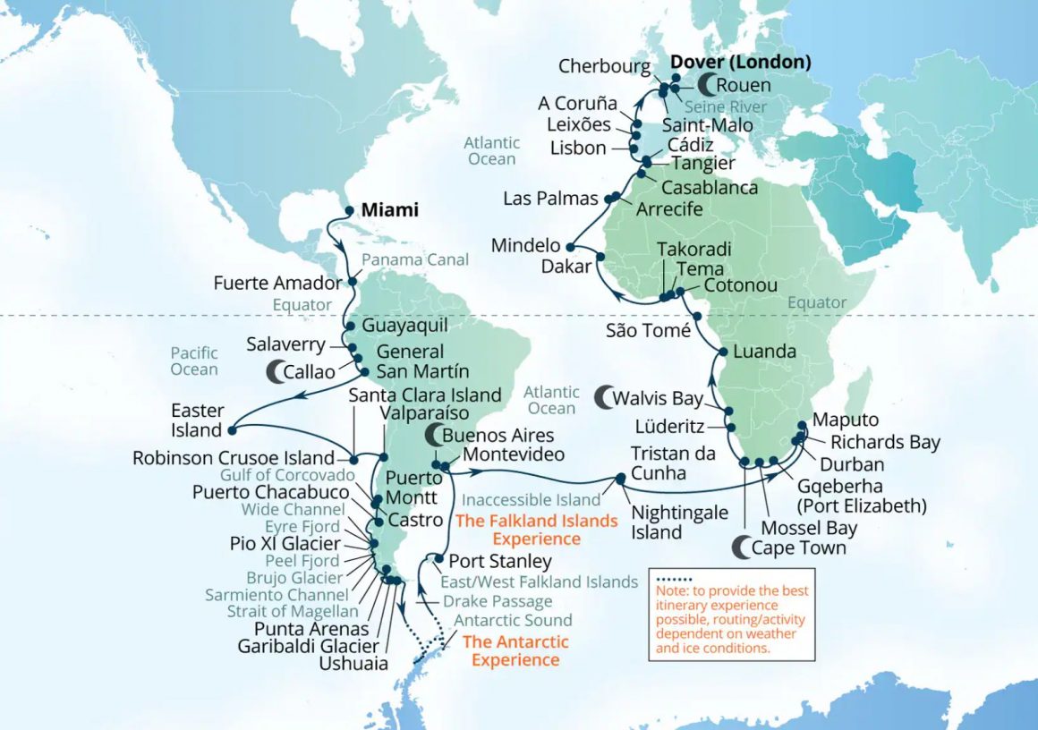 Roteiro por 58 destinos em 23 países, conectando o Cabo Horn ao Cabo da Boa Esperança, com escalas marcantes como a Antártida e a Ilha de Páscoa, atravessando cinco continentes.