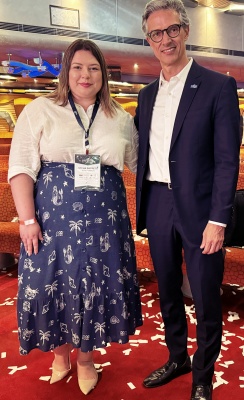 “No início da minha carreira, eu não queria aparecer. Assim como eu, a maioria das pessoas não quer se expor nas redes sociais”, comentou Sylvia Barreto (na foto, ao lado de Marco Ferraz, presidente da CLIA Brasil).